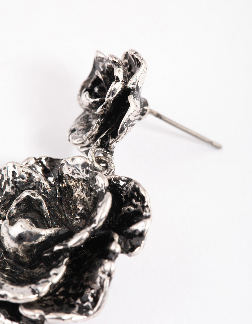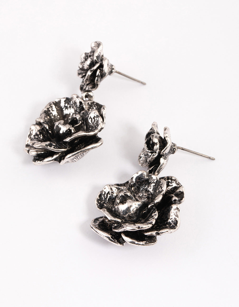 Enter your silver era with these brushed-silver, double rose drop earrings. Pair this set of rose motif, statement earrings with a matching rose necklace for a romantic finish.