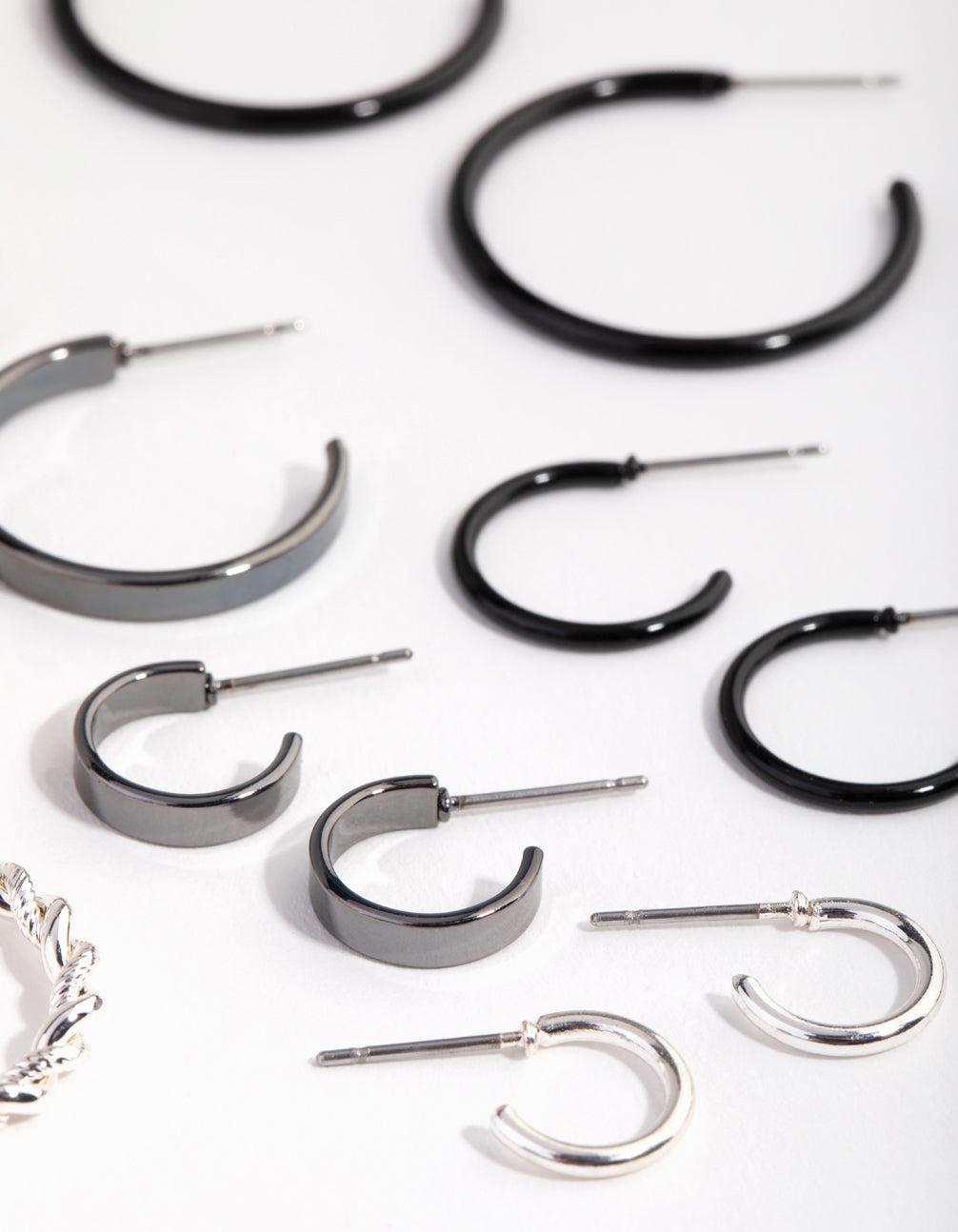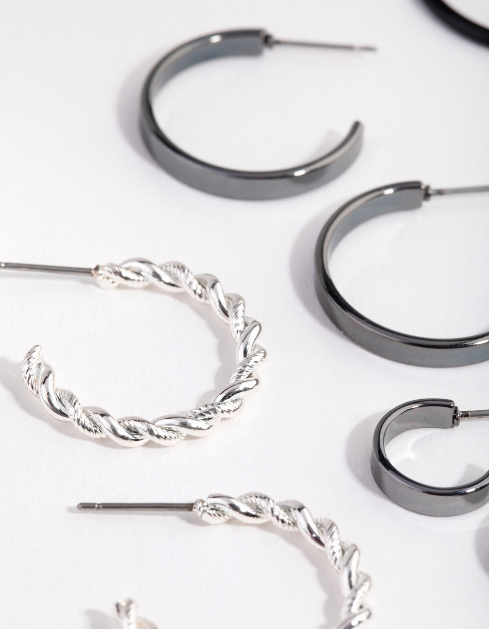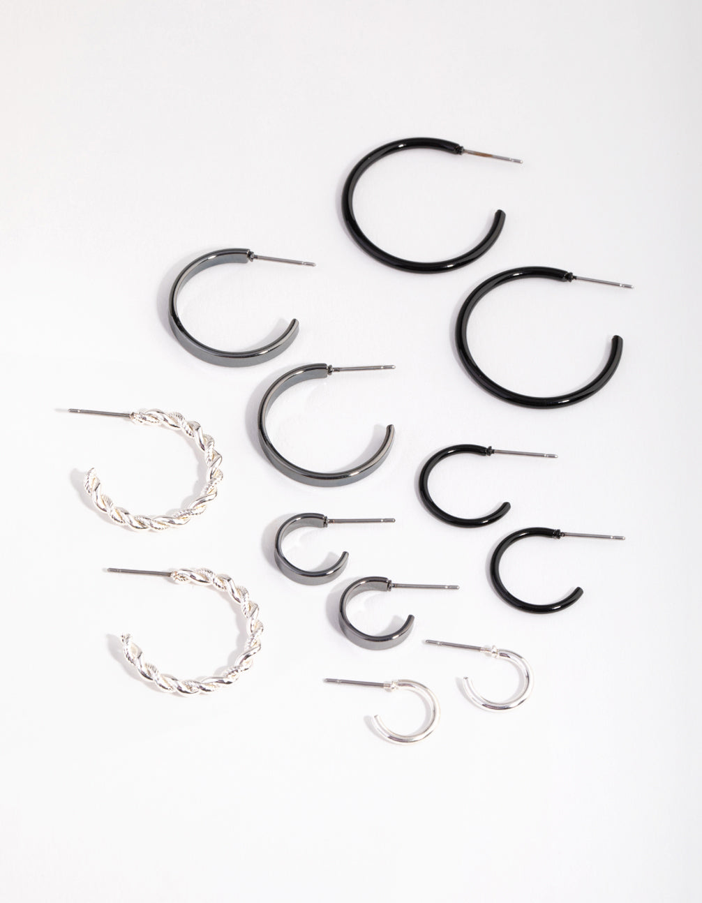 Mix them, match them, stack them! This earring pack includes six pairs of hoop earrings in a mix of black and silver tones. Three are small and three are medium sized, and they feature three different texture designs which makes them perfect for stacking. Change up your look daily, or stack them up together for maxium impact.