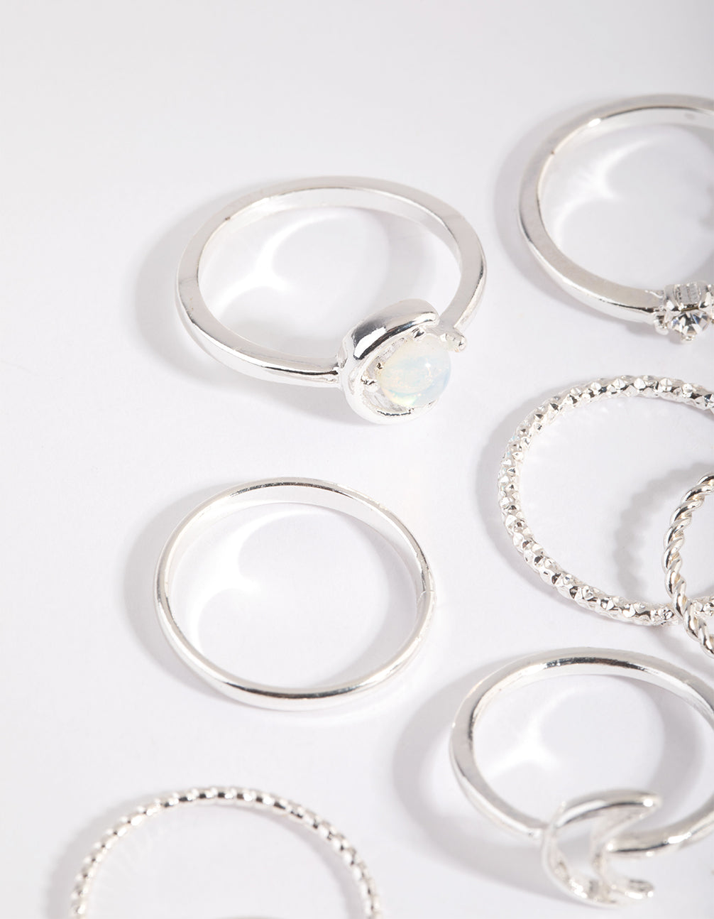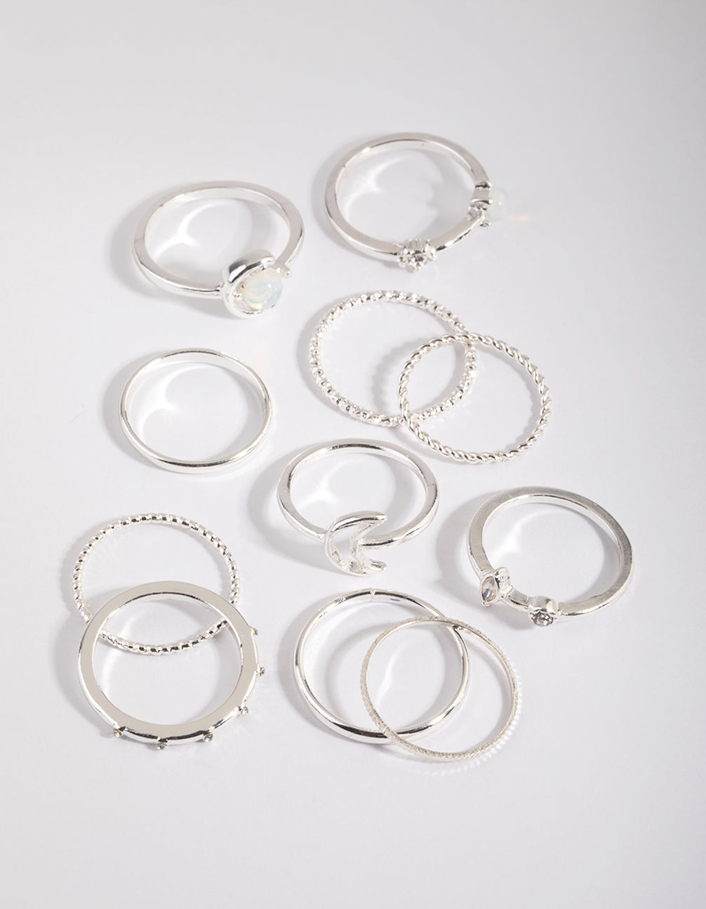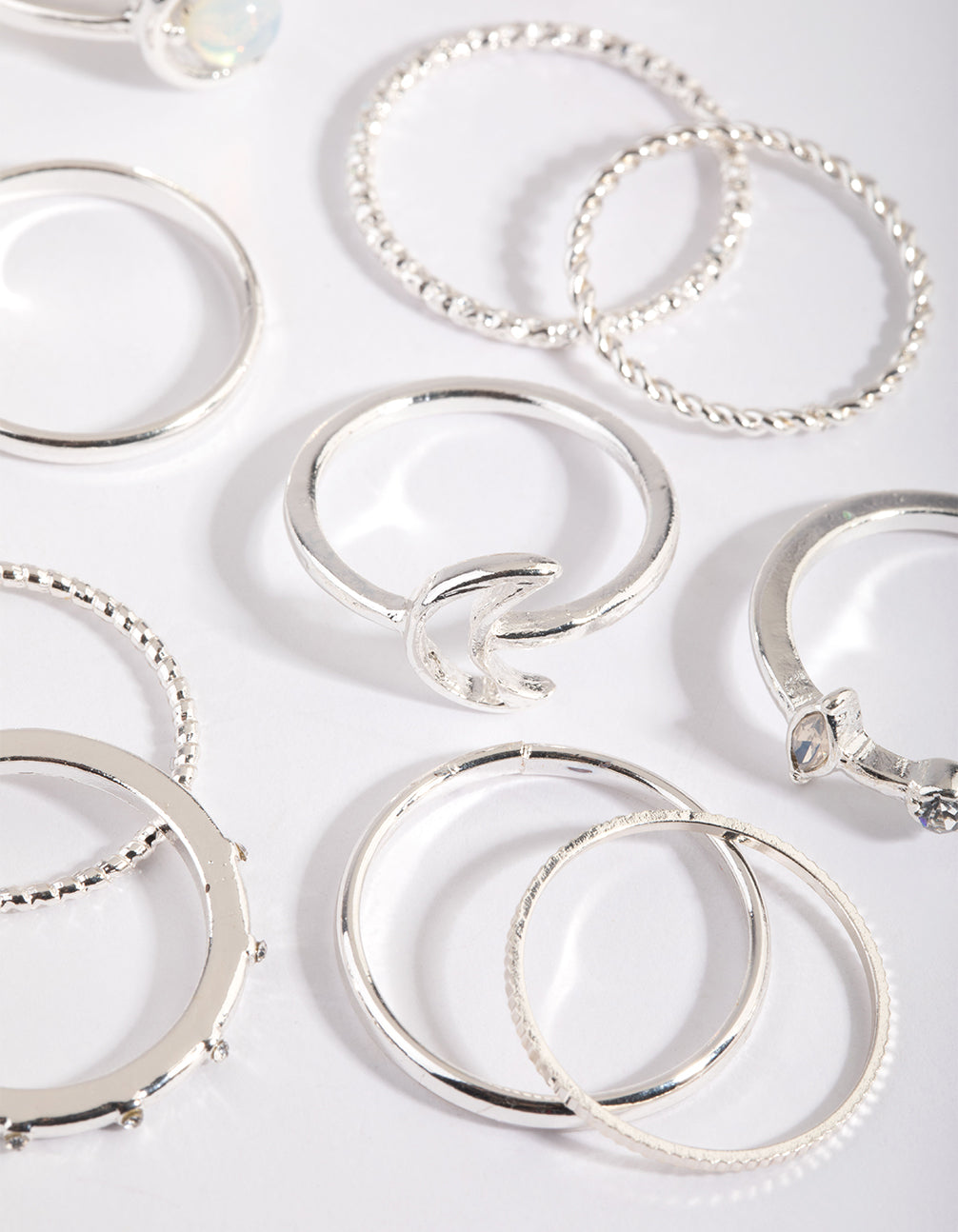 Ring it on! Our lovely rings are designed to be layered together for maximum impact. These ones are silver toned, and they feature charming celestial motifs. Shine like the night sky!