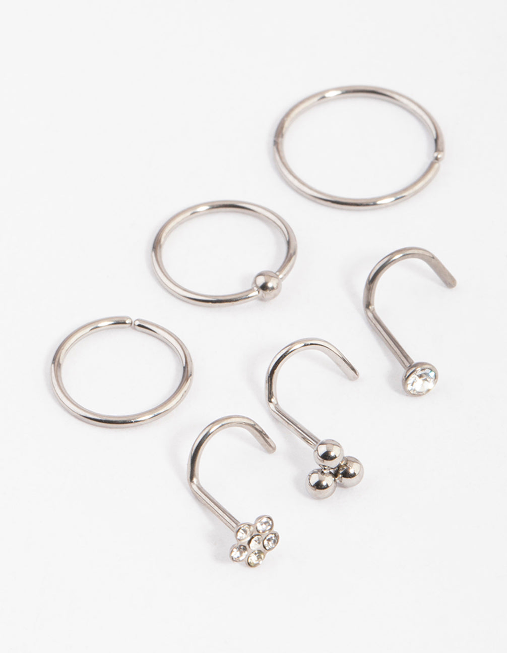 • This pack of nose studs contains six individal nose piercings designed with floral and textured ball accents.