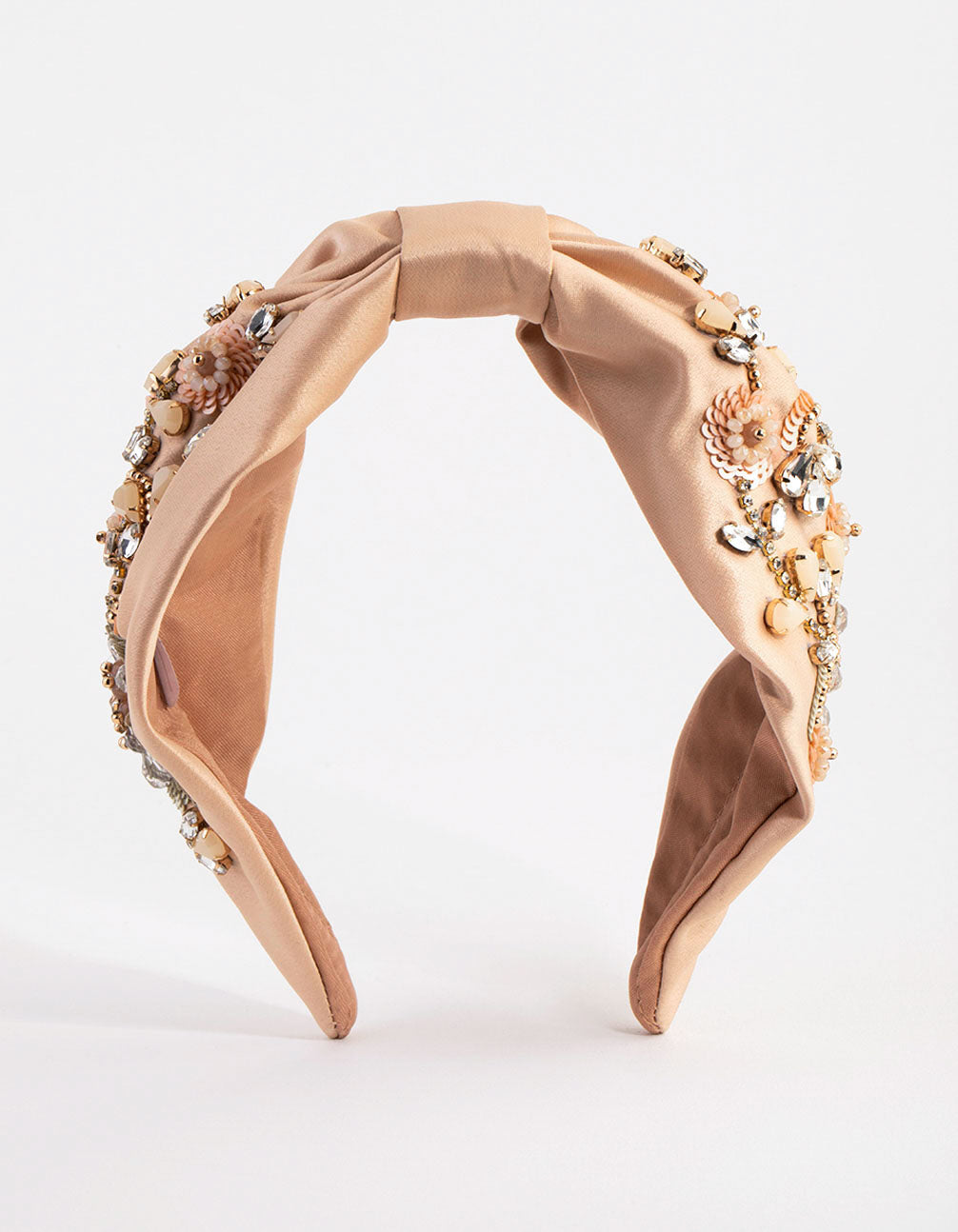 Complete your formal look with statement embellished headbands. This beautiful blush, satin alice band features a knot design with gorgeous hand-sewn beadwork with diamante details. The beads are arranged in a stunning flower design and feature a mix of blush, silver and gold tones that lend the piece a vintage effect.