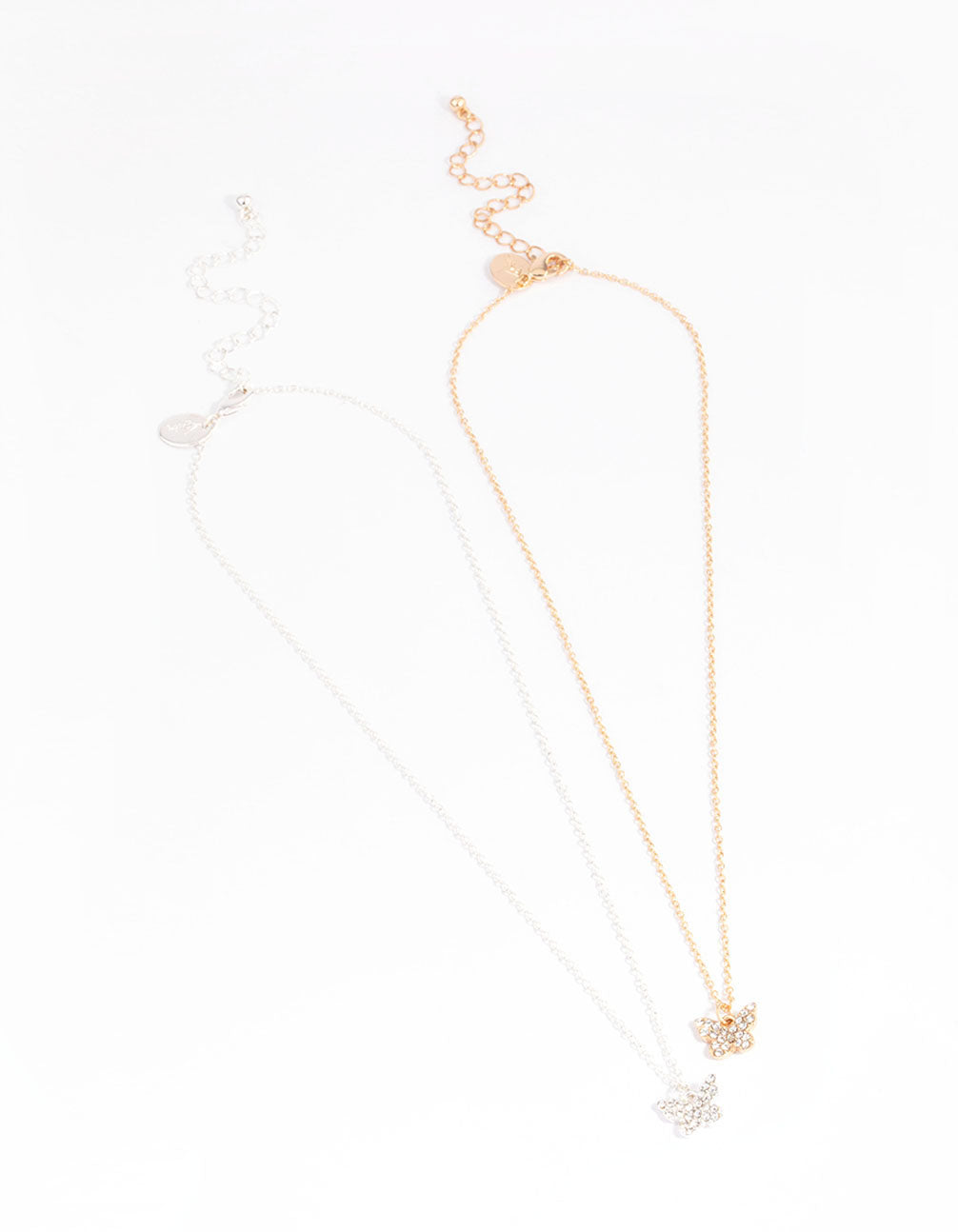 - This necklace pack contains two individual necklaces, designed with diamante embellishments and buttefly motifs, perfect for styling with your bestie.
