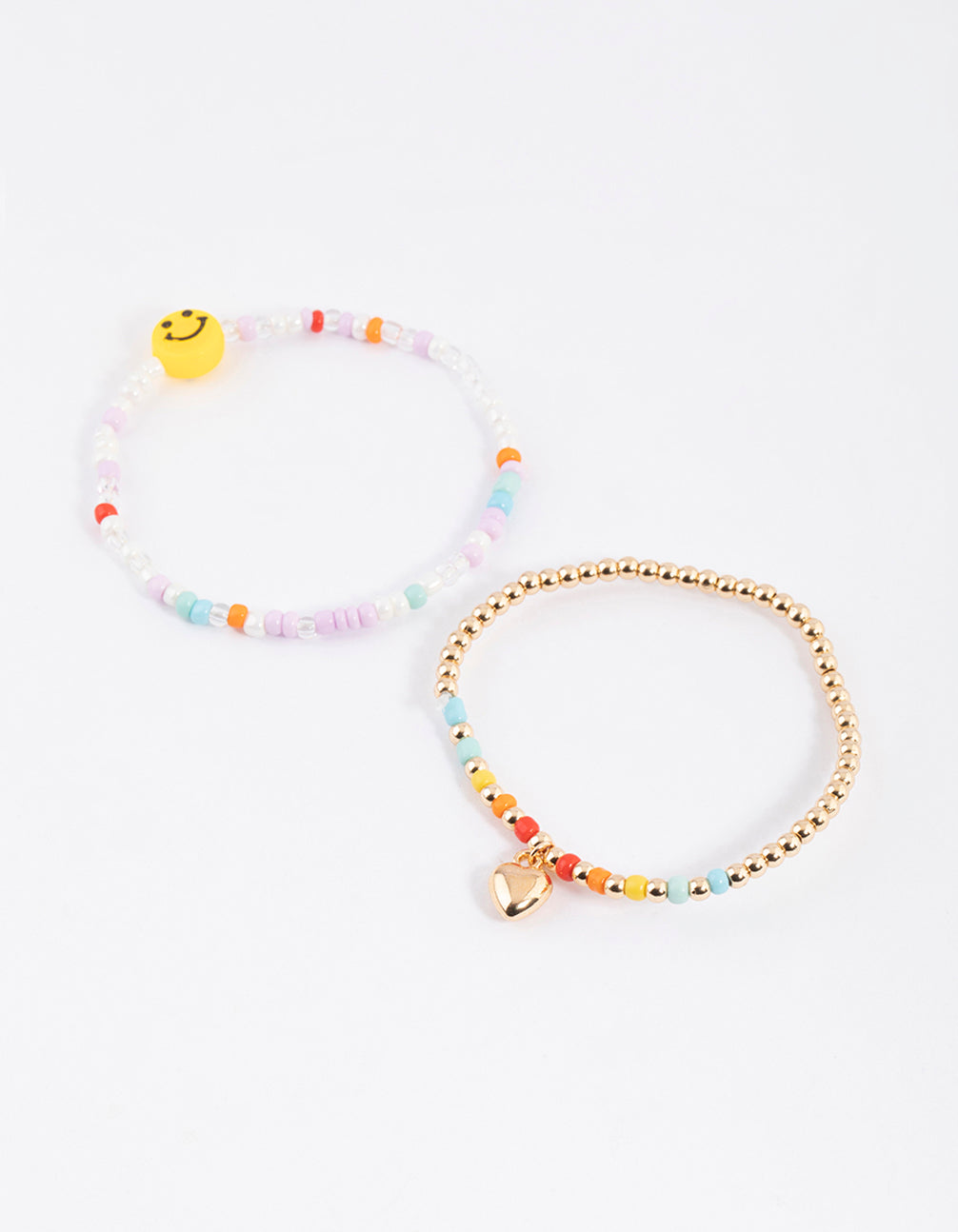 This bracelet pack includes two individual, beaded bracelets - one rainbow and one gold with a smiley face and heart charm.