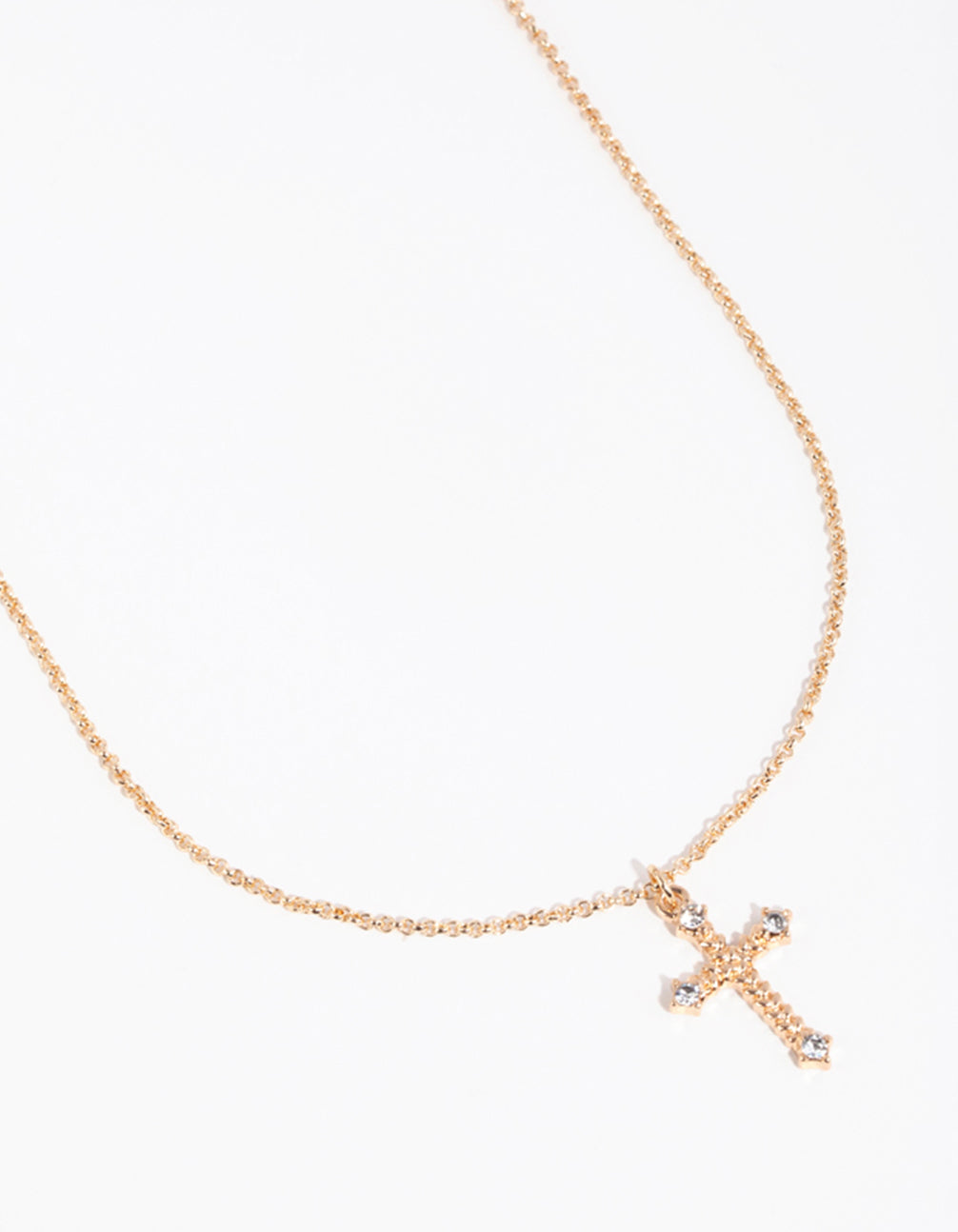 Gold-toned jewellery is chic and versatile. This pendant necklace features a cross charm with diamantes. The chain length measures 45cm.