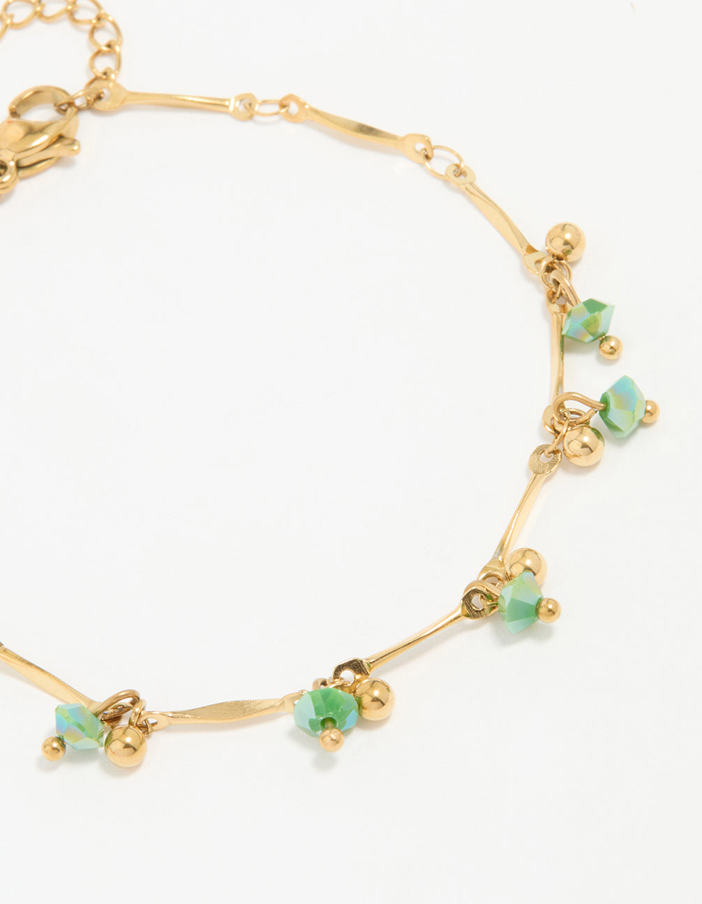 Add a pop of colour to your wrist with this Waterproof Gold Plated Stainless Steel Green Beaded Bracelet. This dainty bracelet blends luxe gold plating with chic green beads, creating a fresh, versatile look. Designed to be sweat, swim, and shower-proof, it's perfect for everything from beach days to brunch dates. Stack it with other wristwear for a layered vibe, or let it shine solo. Crafted from durable stainless steel, this bracelet is as stylish as it is practical. Pair it with casual outfits for a playful touch or dress it up with your favourite dress and heels—it's the ultimate all-rounder accessory!