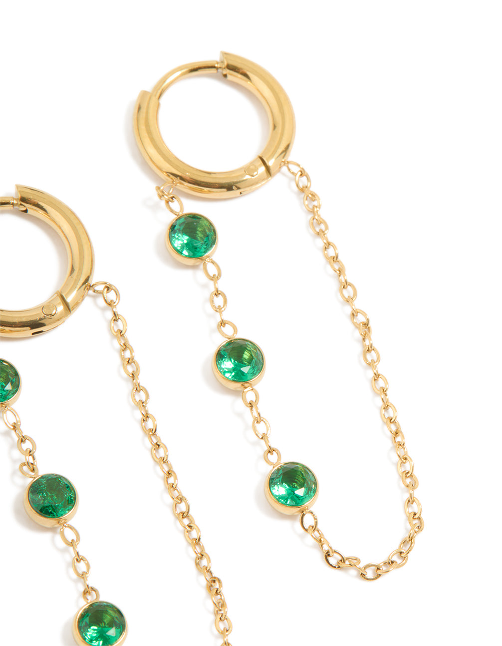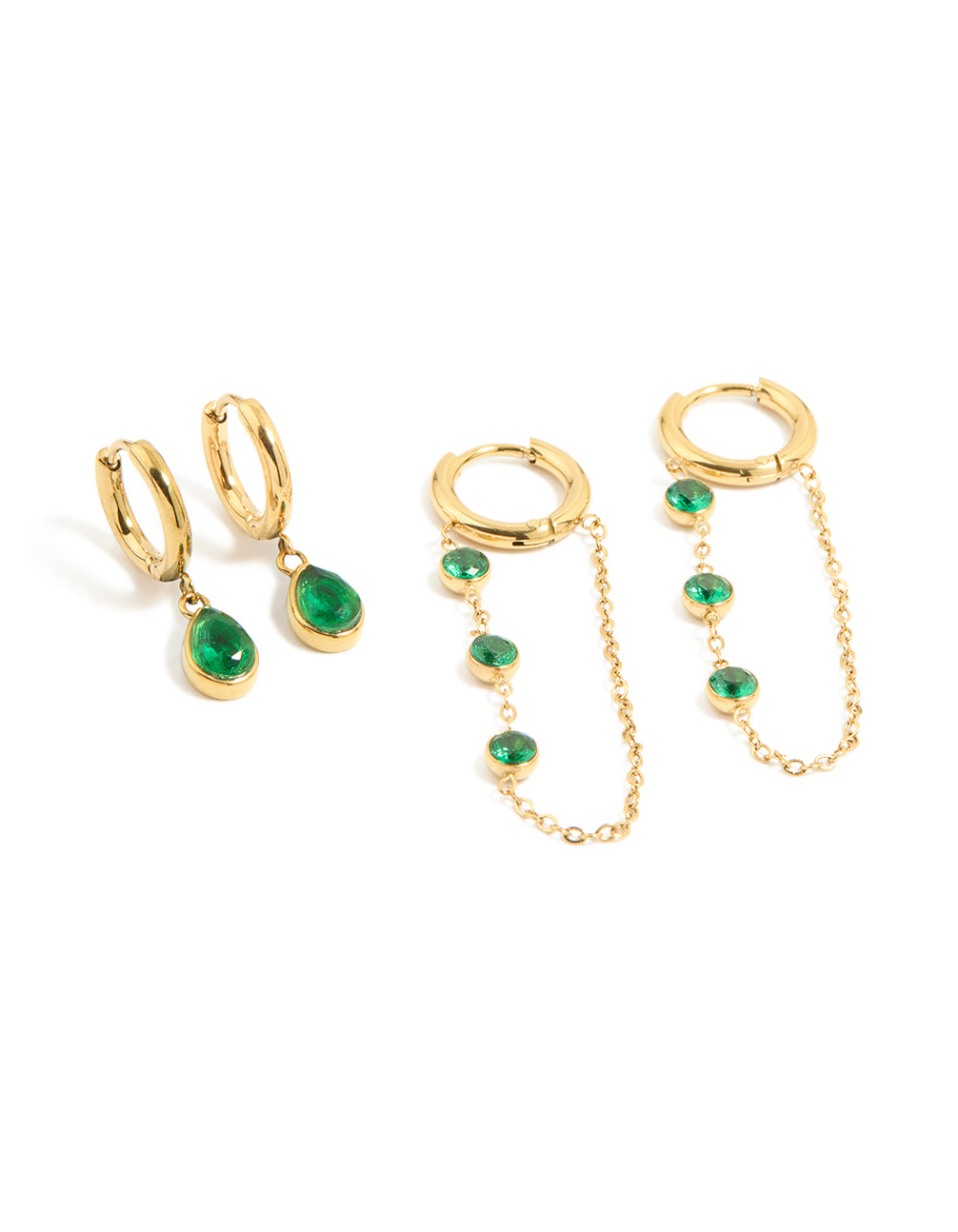 Add a splash of elegance to your look with this Waterproof Gold Plated Stainless Steel Green Cubic Zirconia Huggie Earrings Pack. This versatile earring set includes one pair of classic gold-plated huggie earrings and a second pair featuring a chic chain detail with dazzling green cubic zirconia crystals. The drop style adds movement and flair, perfect for everything from casual brunch dates to glamorous evenings out. Crafted from durable stainless steel with a luxurious gold plating, these earrings are waterproof, meaning you can sweat, swim, and shower without worry. Style them solo for understated charm or stack them for a bold, layered look. Pair with your favourite gold necklace or rings for a polished finish that works anywhere, from the beach to the dance floor.