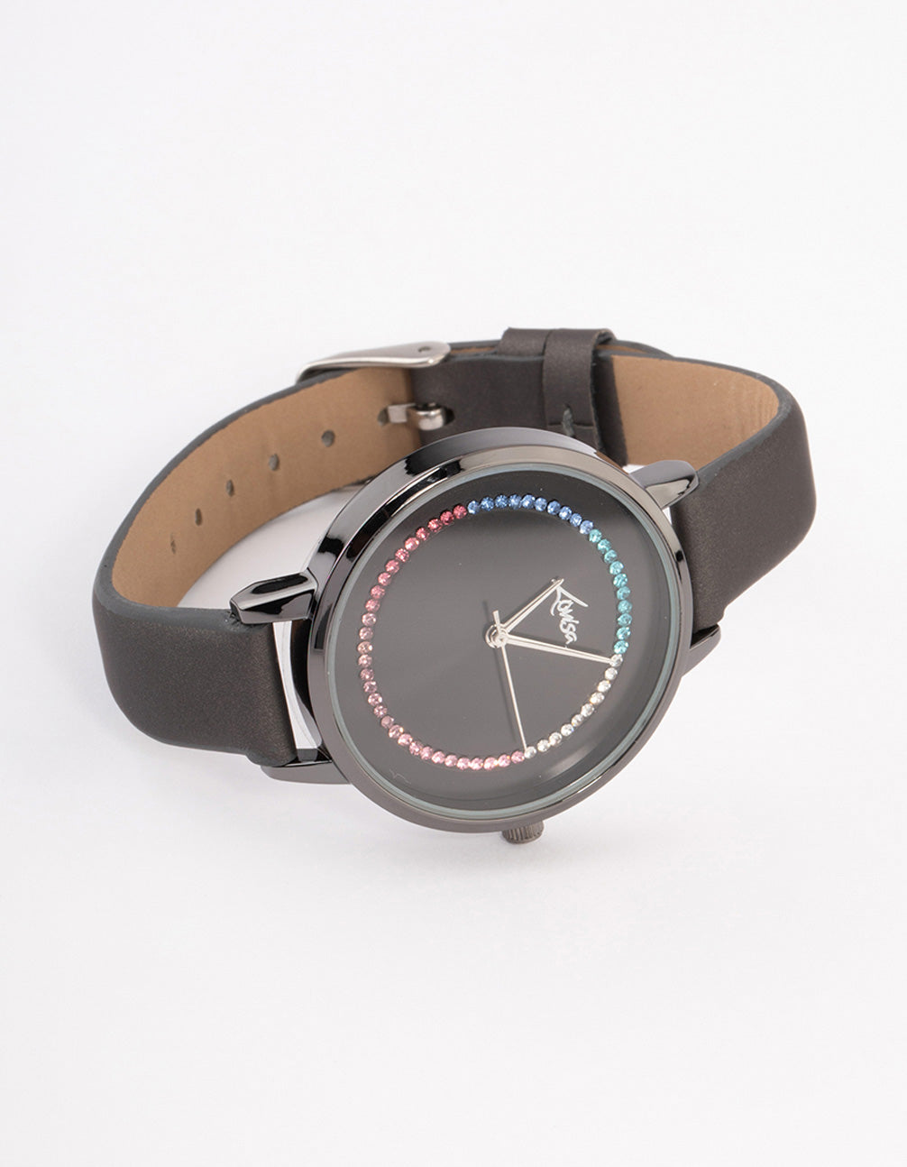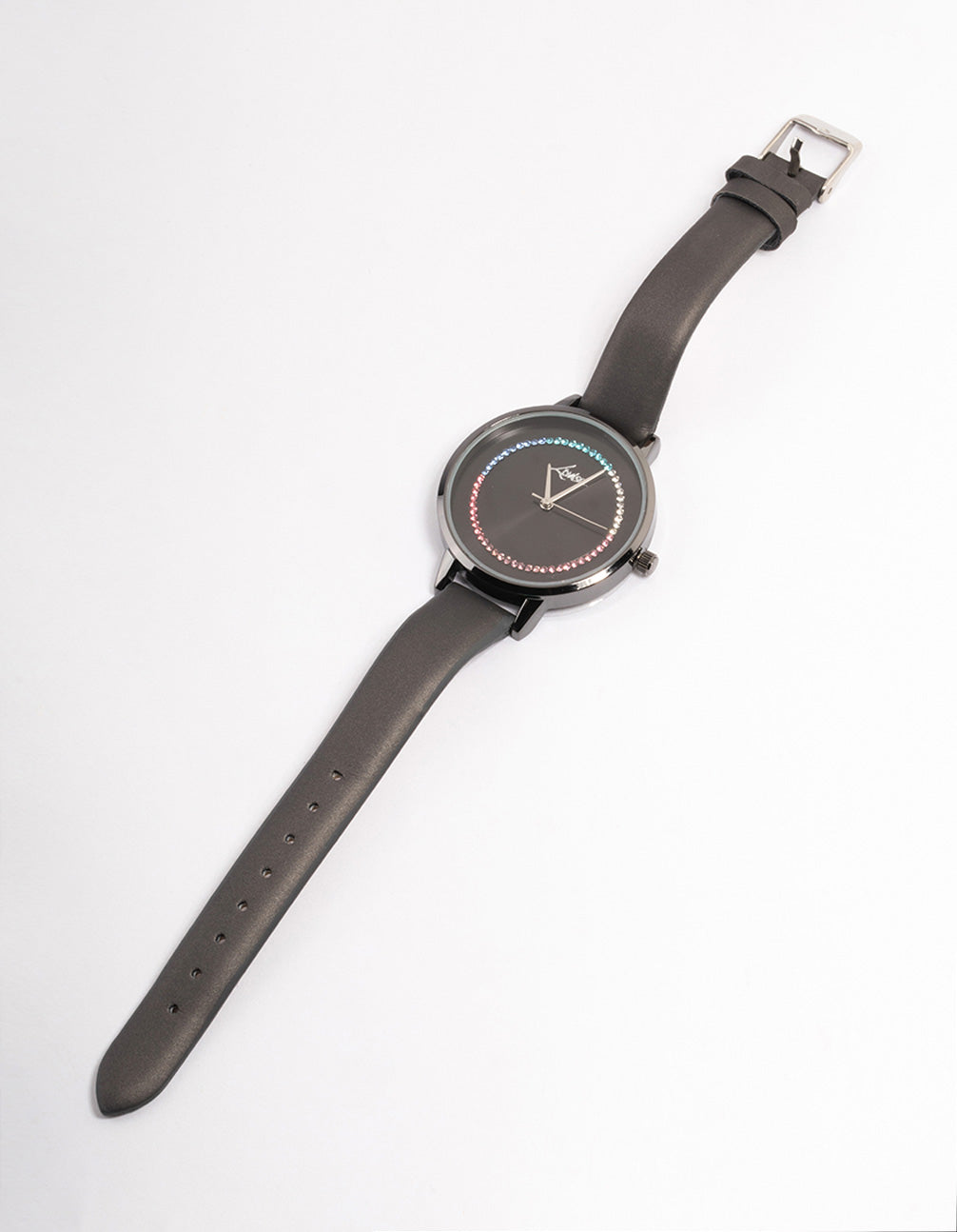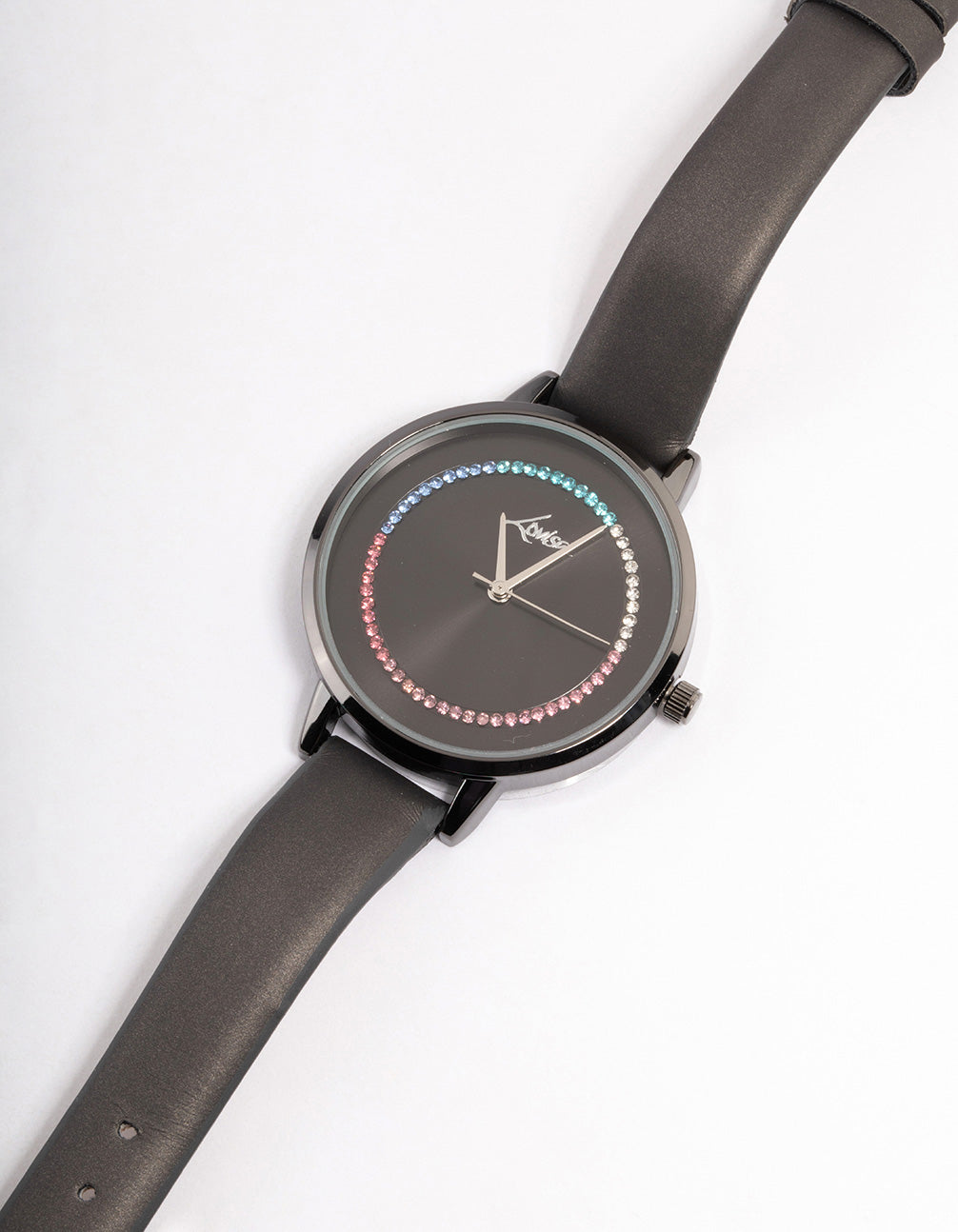 - This watch features a coated black finish with rainbow crystals and a faux leather strap.
