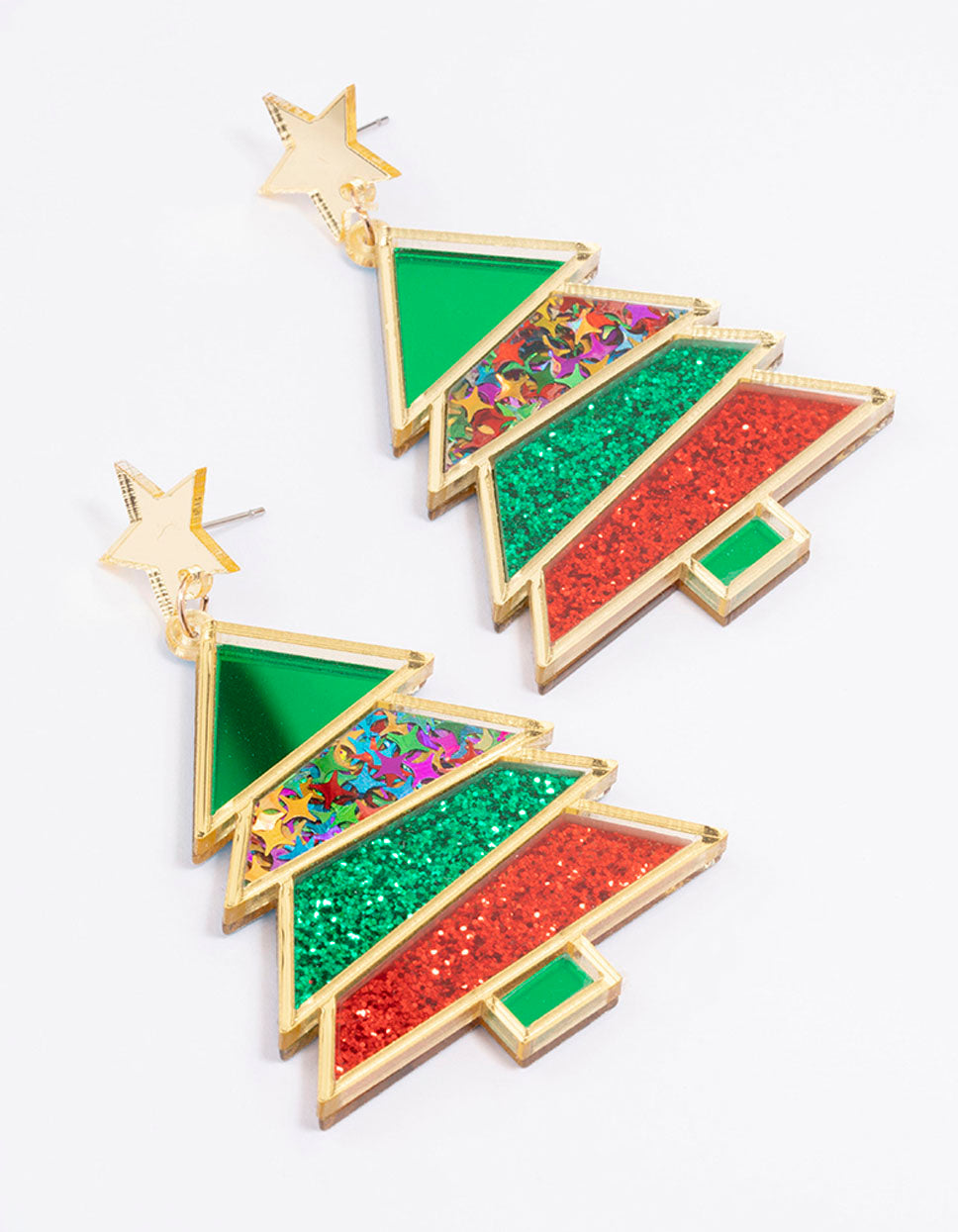 - These gold-toned drop earrings feature a multi-coloured, geometric Christmas tree decorated with green, red and multi-colour glitter for an eye-catching finish.