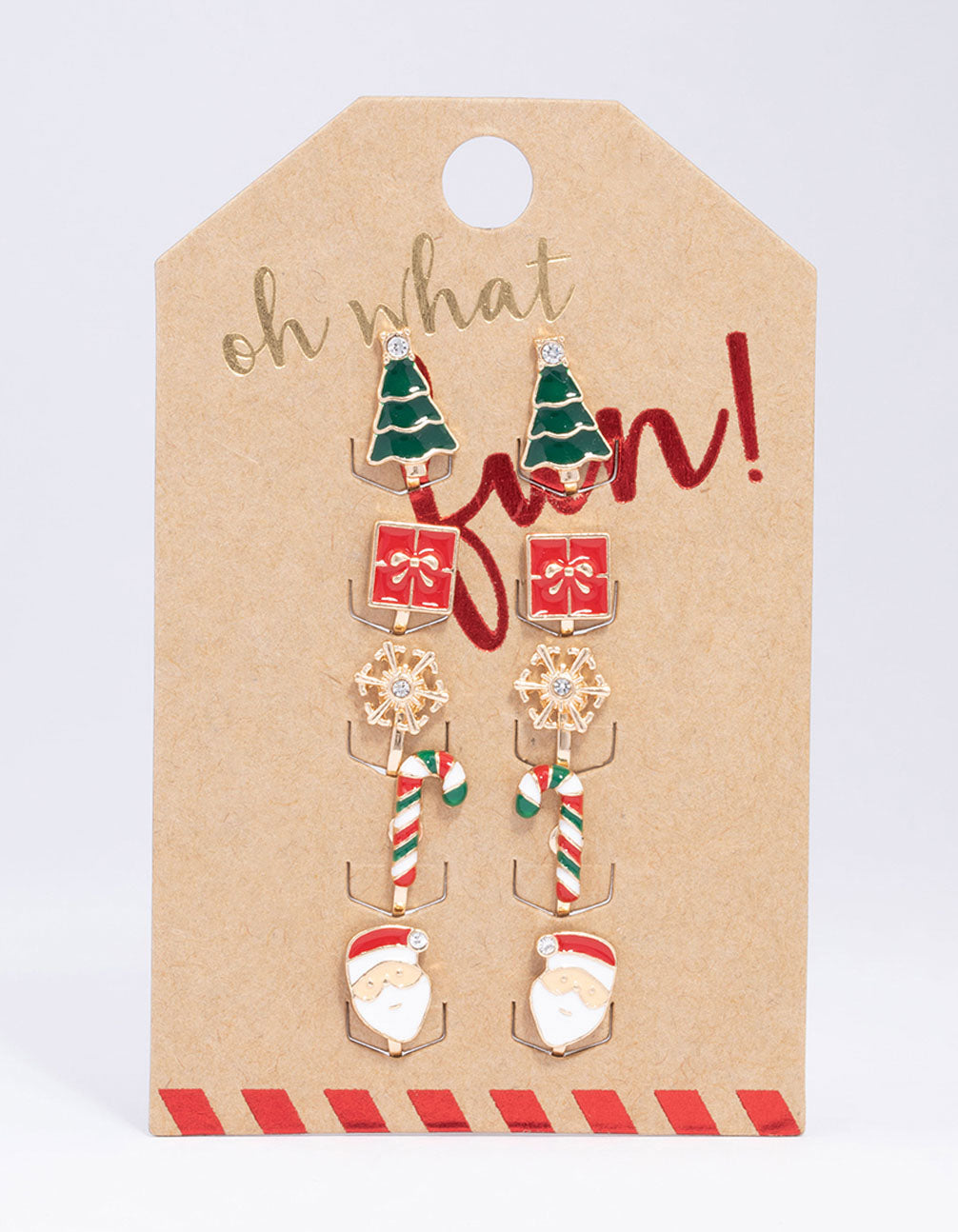 - This earring pack contains five sets of clip on earrings featuring Christmas trees, candy canes, Santas and more.