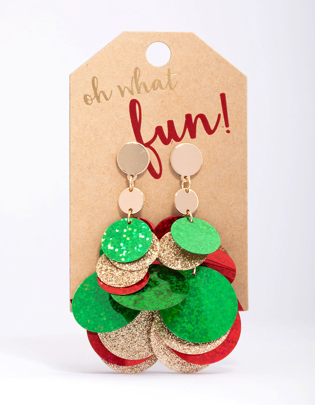- These gold-toned drop earrings feature a collection of red, green and gold glitter discs for a maximalist, festive finish.