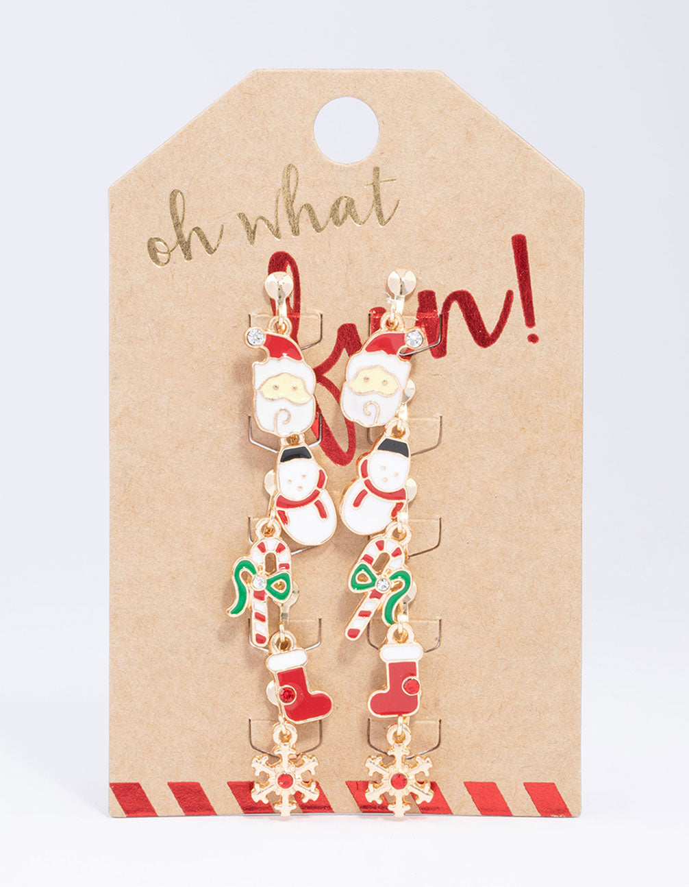 - This earring pack contains five sets of clip on earrings featuring snowmen, stockings, Santas and more.