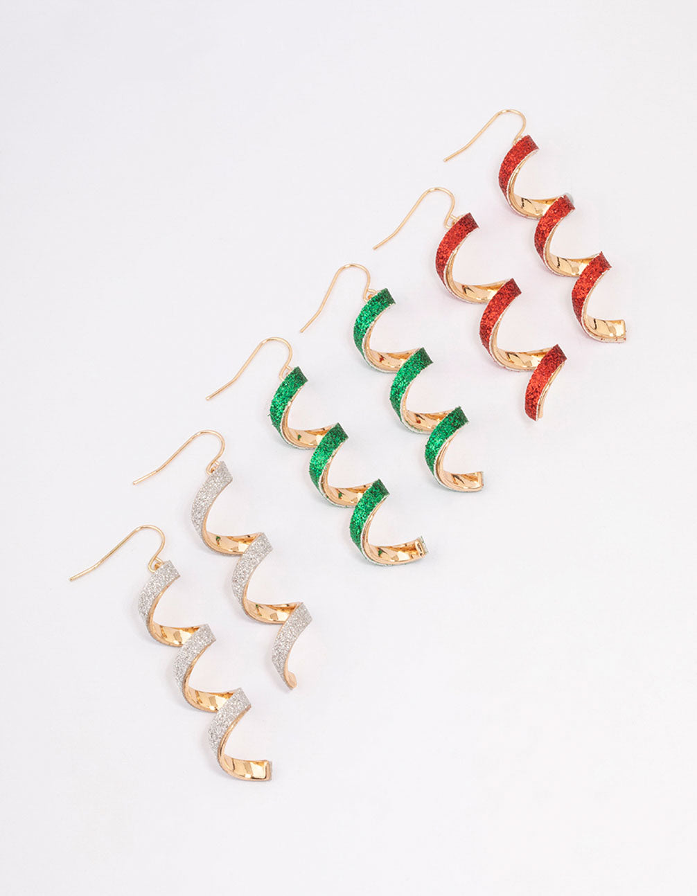 - This earring pack contains three sets of spiral drop earrings, designed with red, green and silver glitter for an eye-catching finish.