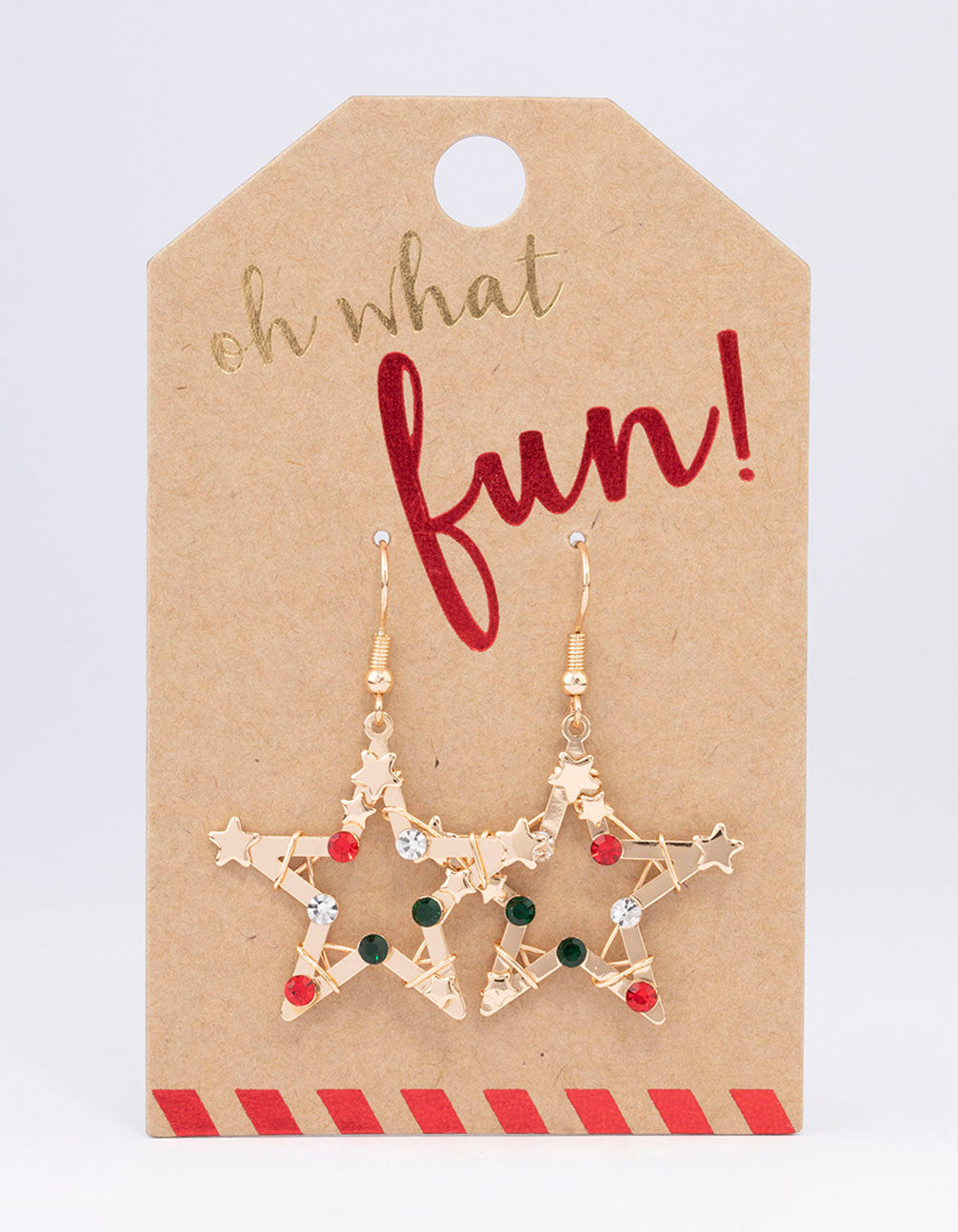 - These gold-toned drop earrings feature a large star design embellished with green, red and silver diamantes for a curated finish.