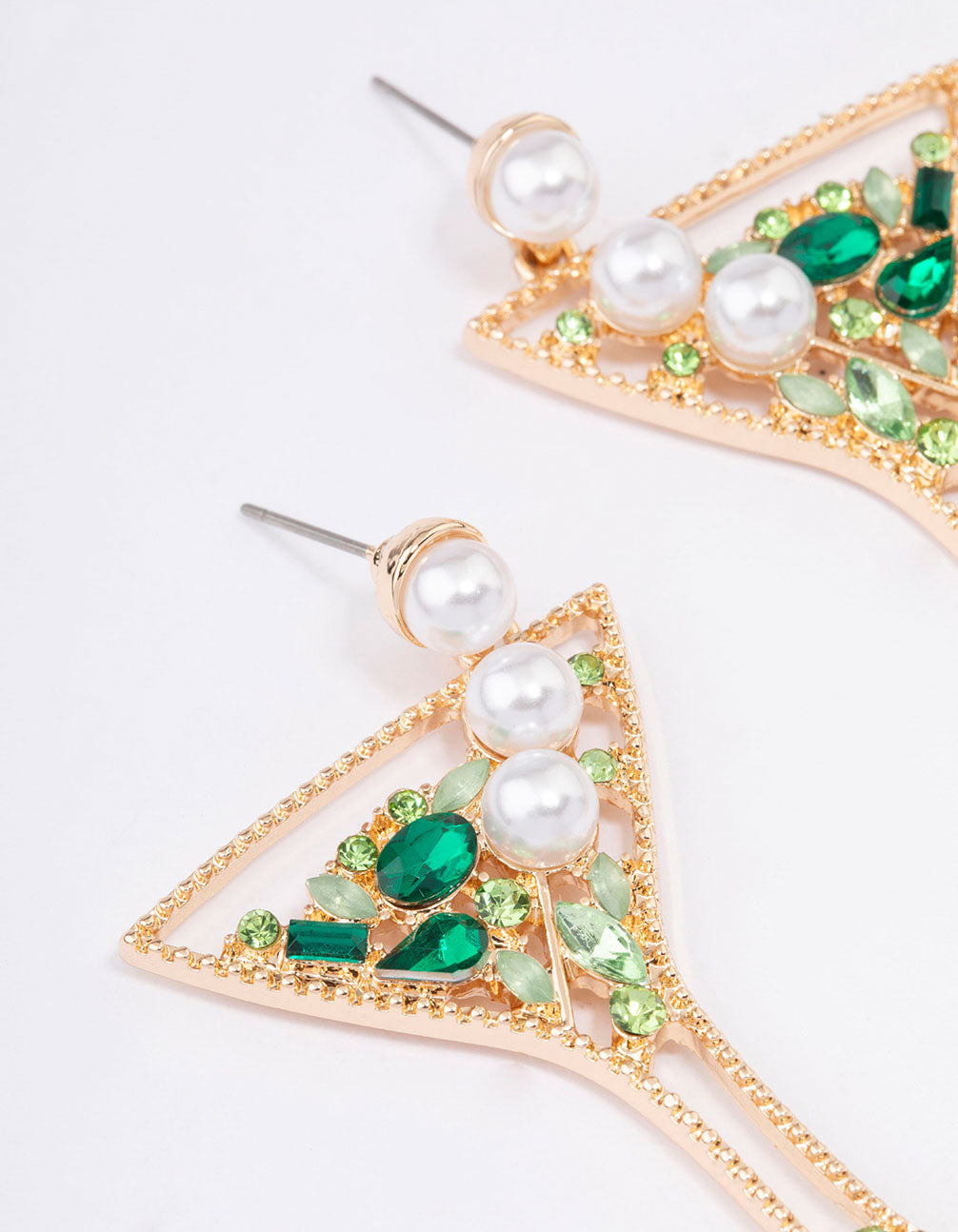 - These gold-toned drop earrings form the shape of a cocktail glass, embellished with green gemstones and pearls for a celebratory finish to your outfit.