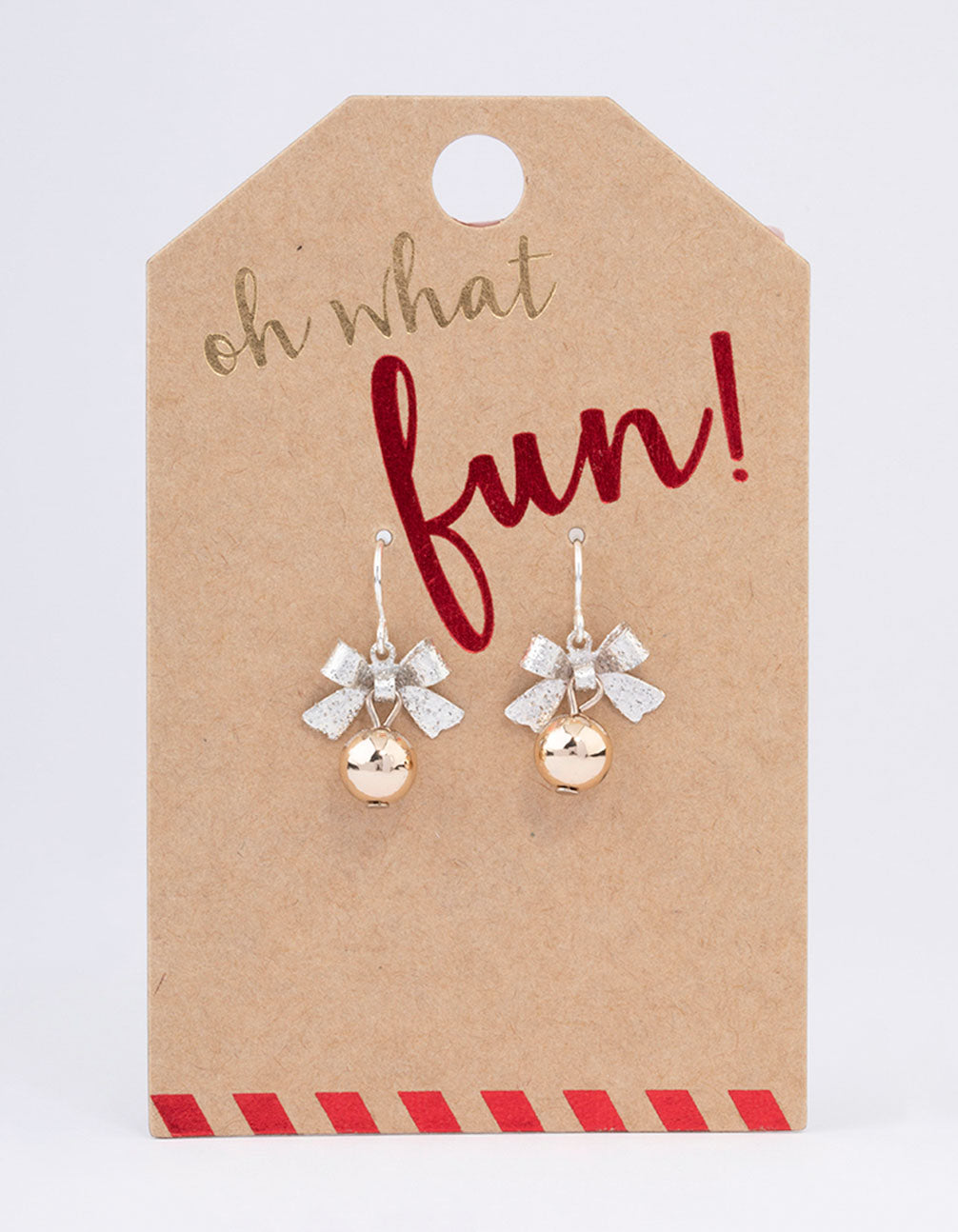 - These silver drop earrings feature a miniature bauble design adorned with a sparkly bow on the top for a traditional and decorative festive look.