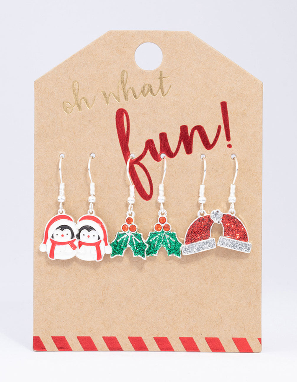 - This earring pack contains three sets of silver-toned Christmas earrings featuring adorable penguins, holly and glittery Santa hats.