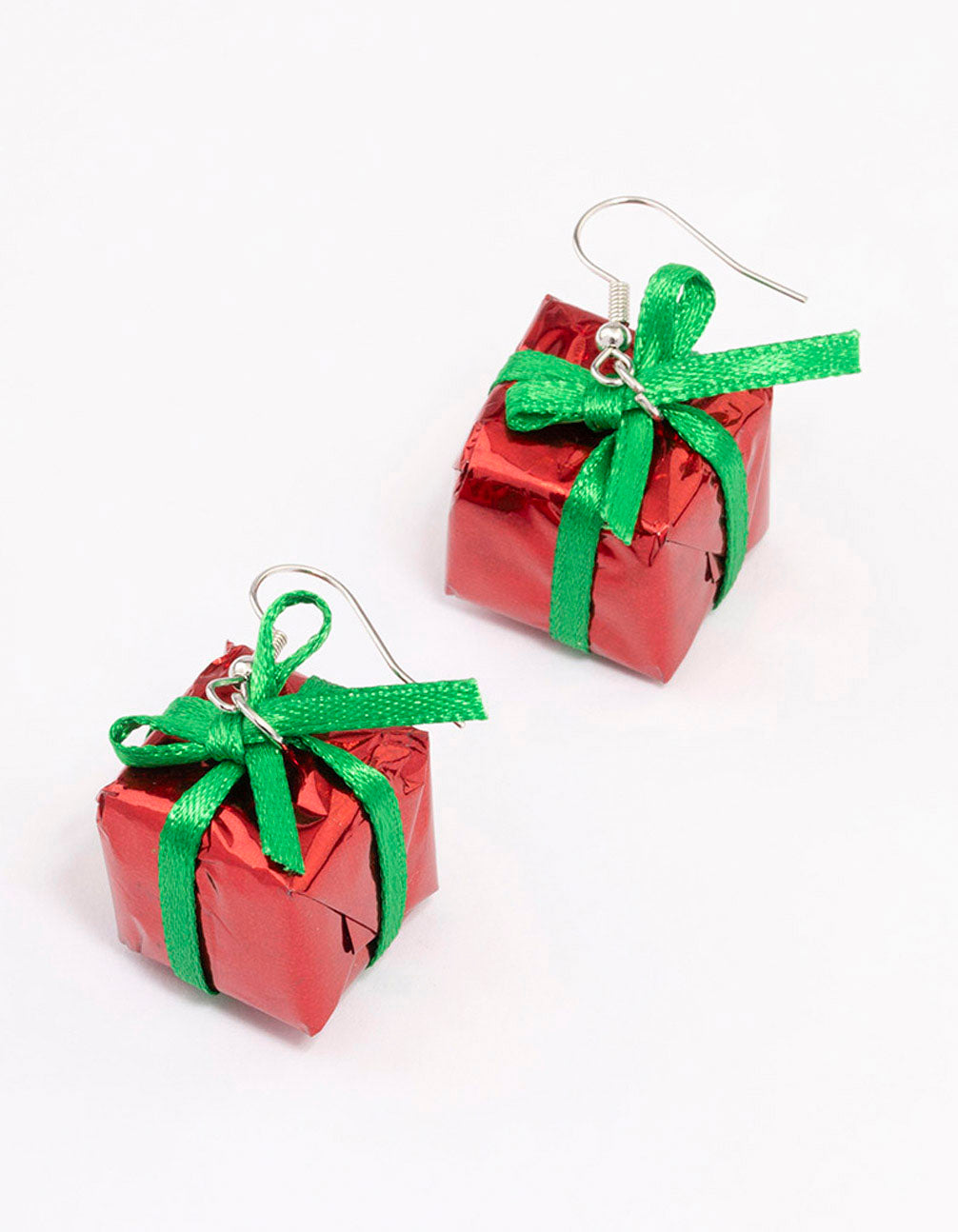 - These silver drop earrings feature miniature red present motifs with green bows for a cute, Christmasy finish to your outfit.