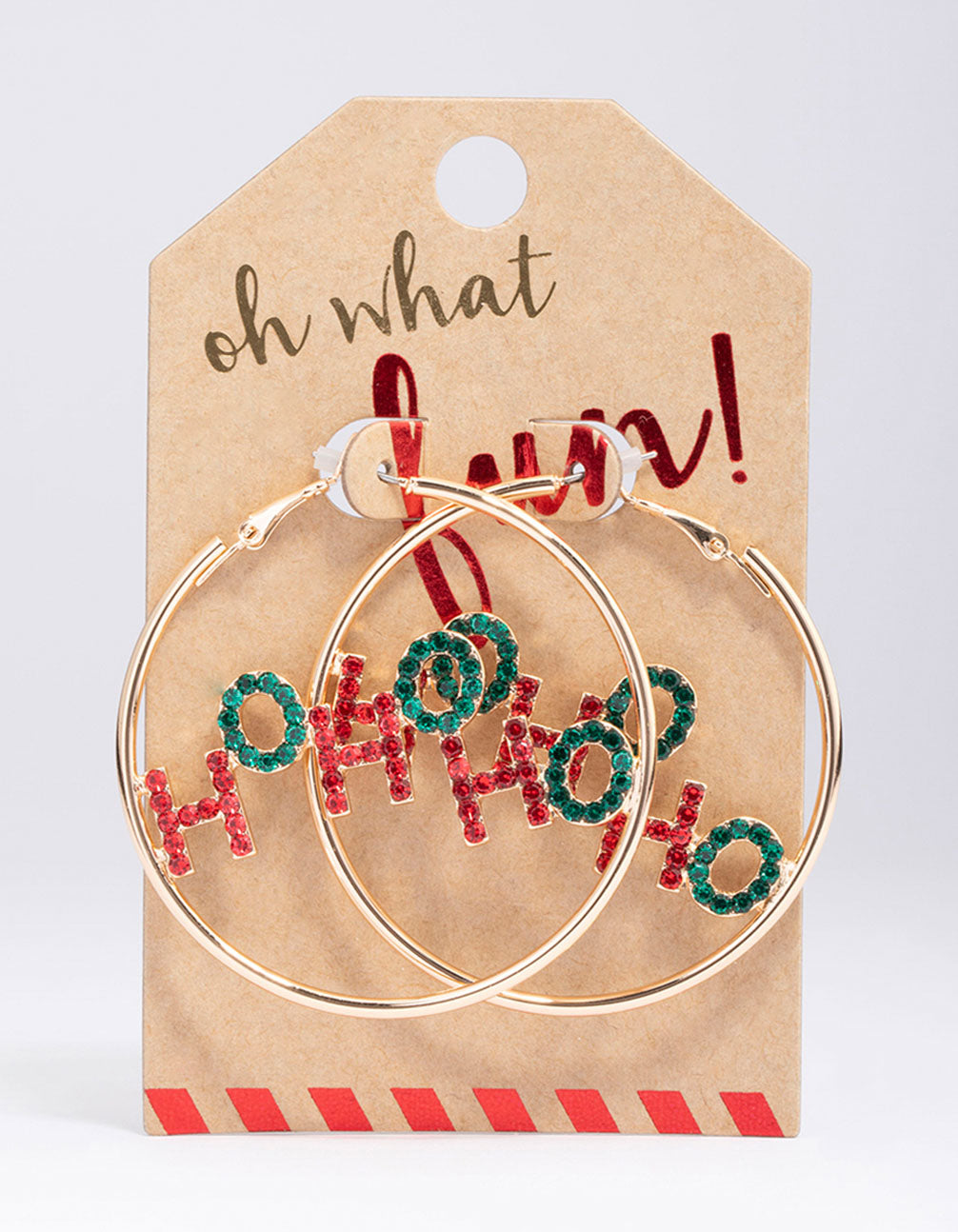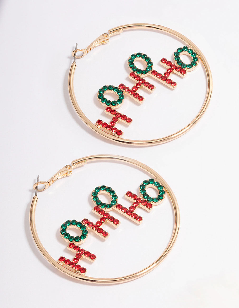 - These gold-toned hoop earrings feature green and red letters that spell 'Ho Ho Ho' in the centre for a jolly finish to your look.