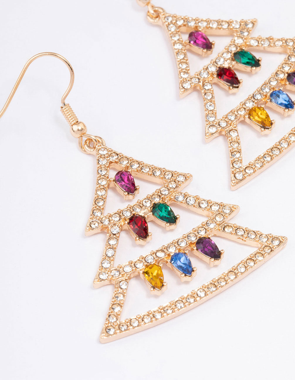 - These gold-toned drop earrings feature two large Christmas tree outlines, adorned with glitter and rainbow gems to mimic Christmas lights.