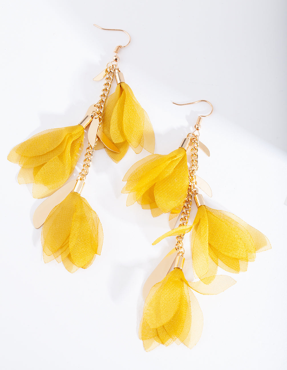 A fun pair of fashion earrings are an easy way to spice up your daily ensembles! Add some colour and experiment with your style. These gold-tone chain earrings boasts of two mustard coloured fabric flowers with gold-tone petals. Style with antique style gold layered necklaces and chunky rings for a bold look.